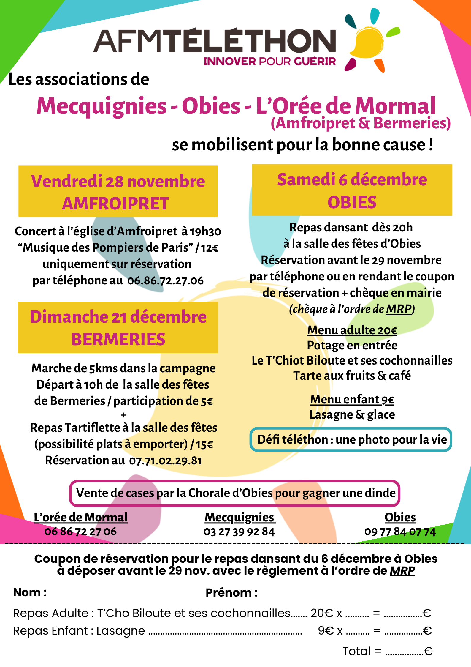 Les communes d’Obies, Bermeries, Amfroipret et les alentours s’unissent pour soutenir le Téléthon 2025 à travers plusieurs actions solidaires et festives.